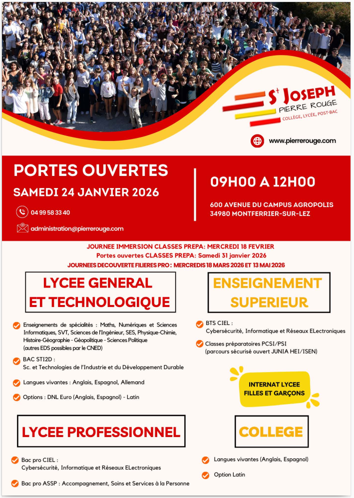 Sur cette page, vous trouverez toutes les affiches annonçant les Journées Portes Ouvertes des lycées. Elle sera régulièrement mise à jour. Lycée St Joseph Pierre rougeAgro Campus Nimes Rodilhan